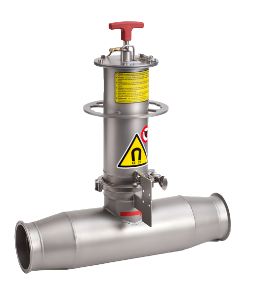This separator is designed for semi-liquid or dense liquid mixtures that might block a standard, flow-type separator, characterized by thinner magnetic pipes. The device is finding its application area in the food and/or meat industries. In the separator body, there is just one magnetic pipe with the diameter of 60 mm, around which all separated material is flowing – i.e. coarsely milled meat and entrails. The separator does not include a flow labyrinth, so a fluent material flow is warrantied. The separator may be situated within a pressure pipeline characterized by the maximum pressure of 10 bar. On its upper side, the magnetic component is equipped with a padlock preventing unauthorized pulling the magnetic pipe out when the material is flowing within the pipeline.